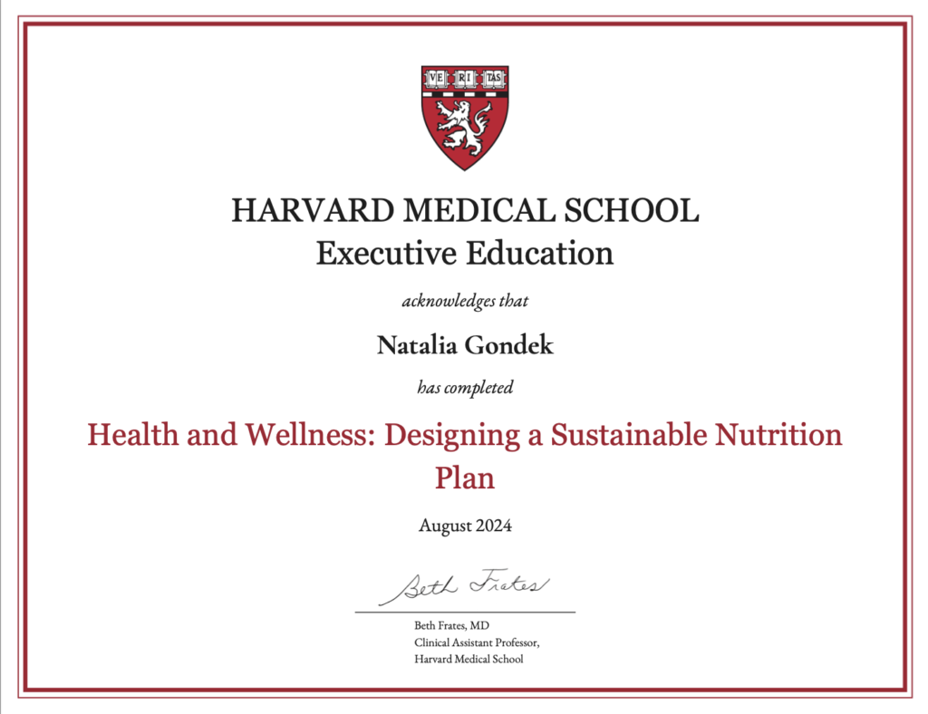 Jestem absolwentką programu Lifestyle Medicine (Medycyna Stylu Życia) na Harwardzkim Uniwersytecie Medycznym – jest to dziedzina mało znana w Polsce, a bardzo rozwinięta na zachodzie. W Medycynie Stylu Życia stosuje się szereg zabiegów popartych dowodami naukowymi działając na 6-ściu obszarach życia aby zoptymalizować zdrowie i skutecznie wyleczyć wiele jednostek chorobowych. Obszary te obejmują: Odżywianie, Aktywność fizyczna, Sen i Regeneracja, Stres, Relacje, Substancje problematyczne.