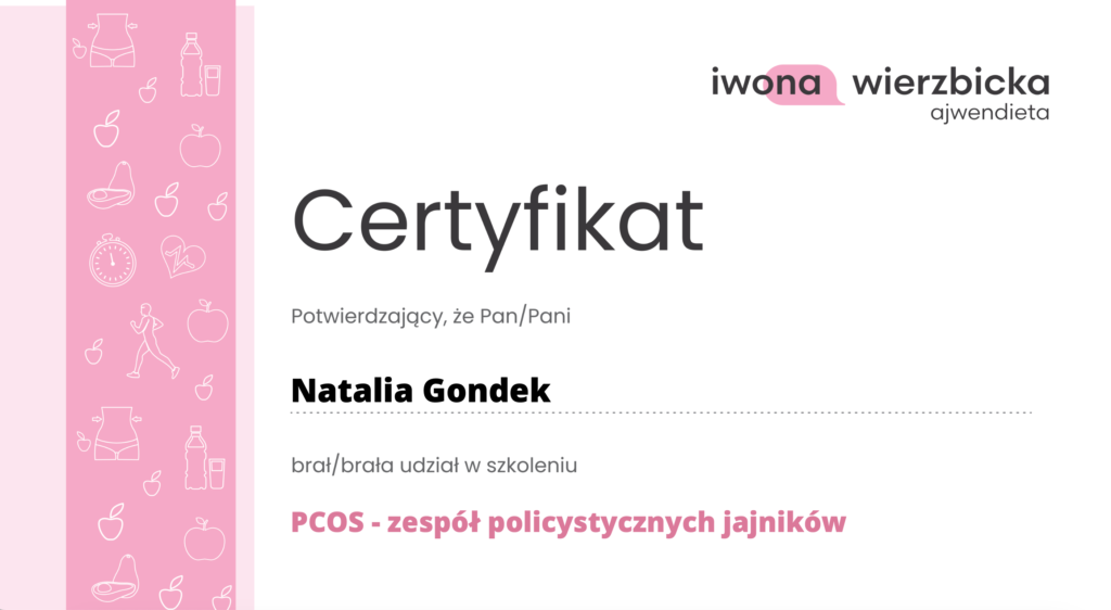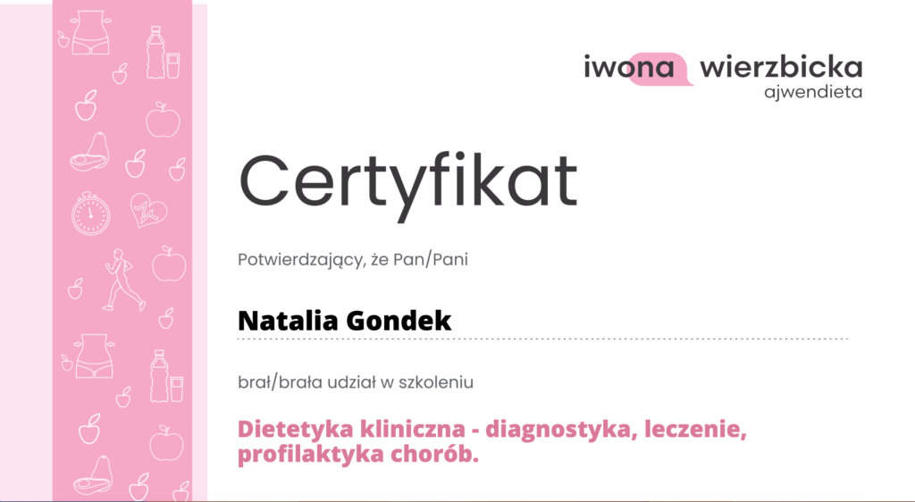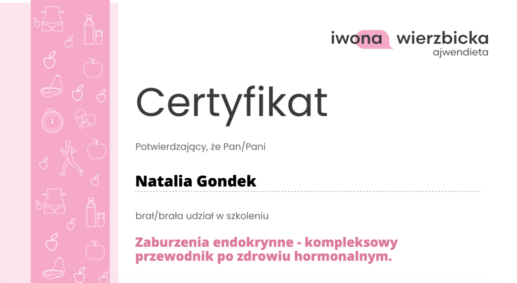 Ukończyłam liczne szkolenia i kursy oraz brałam udział w wielu webinarach oraz konferencjach z zakresu gospodarki hormonalnej, zaburzeń układu pokarmowego, mikrobiomu jelitowego czy szeroko pojętego zdrowia. Uczyłam się od osób takich jak Oskar Kaczmarek („doktor Mikrobiom”), Iwona Wierzbicka, Olga Grech czy Roksana Środa.